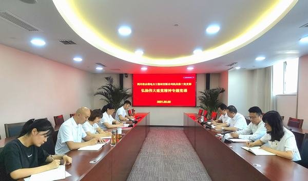 2021年9月9日,公司機關第二黨支部在成都總部會議室組織召開弘揚偉大建黨精神專題黨課報告會,資陽辦公區黨員以視頻方式聆聽報告會。公司黨委書記、董事長代勇,黨委專職副書記唐驚濤,黨委委員、紀委書記陳盛華以普通黨員身份參加會議。入黨申請人列席會議。工會副主席、機關第二黨支部書記付麟麗主持會議。