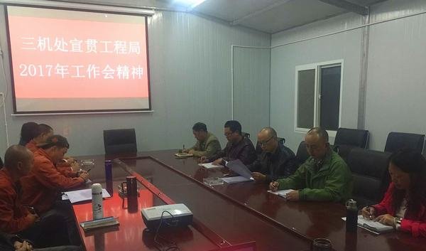 2017年3月27日晚,第三機械化施工處在博瓦電站項目部會議室組織全處干部職工學習貫徹工程局2017年工作會議精神。