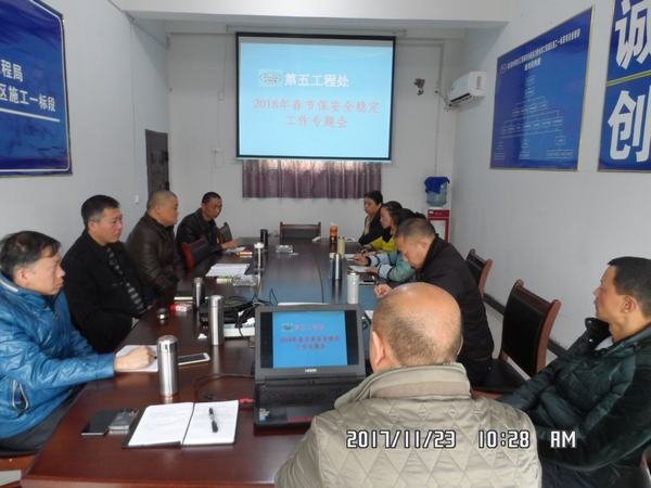 2017年11月23日,局第五工程處2018年春節保安全促穩定工作專題會在安岳縣關刀橋灌區一標項目部會議室召開。會議由第五工程處處長陳道剛主持,處領導班子成員及部分科室負責人參加。