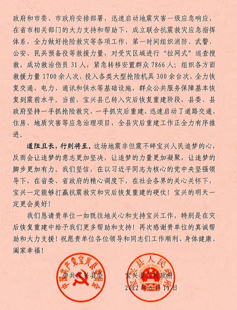 中共寶興縣委、寶興縣人民政府致工程局公司感謝信