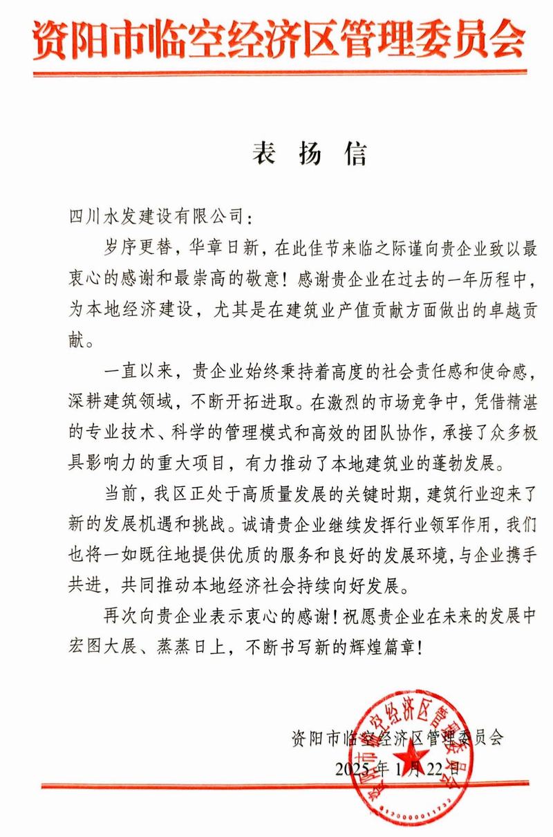 1月24日,公司收到資陽市臨空經(jīng)濟(jì)區(qū)管委會(huì)發(fā)來的表揚(yáng)信,信中對(duì)公司在2024年度為本地經(jīng)濟(jì)建設(shè),尤其是在建筑業(yè)產(chǎn)值方面的卓越貢獻(xiàn)予以充分肯定。