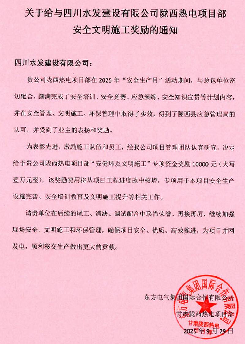 9月29日,由公司承建的甘肅隴西縣熱電聯(lián)產(chǎn)(背壓式)供熱、供汽建設(shè)工程項(xiàng)目部再次收到東方電氣集團(tuán)國際合作有限公司的表揚(yáng)。