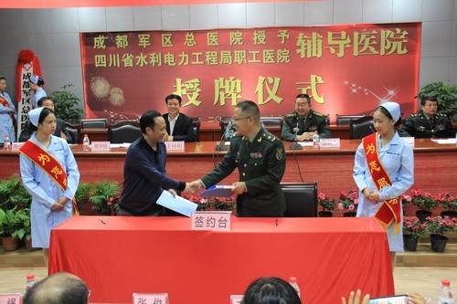 成都軍區(qū)總醫(yī)院外聯(lián)部主任、高級工程師張虎軍與局職工醫(yī)院副院長樊學良現(xiàn)場簽訂了協(xié)作醫(yī)院合作協(xié)議,譚映軍大校為合作醫(yī)院授牌。