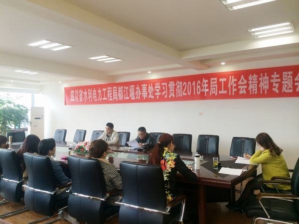 2016年4月12日上午,局都江堰辦事處在水利大廈三樓會(huì)議室召開(kāi)專題會(huì)議,學(xué)習(xí)貫徹工程局2016年工作會(huì)精神。會(huì)議由都江堰辦事處黨支部書(shū)記、工會(huì)主席孫代華主持,辦事處全體職工參加會(huì)議。
