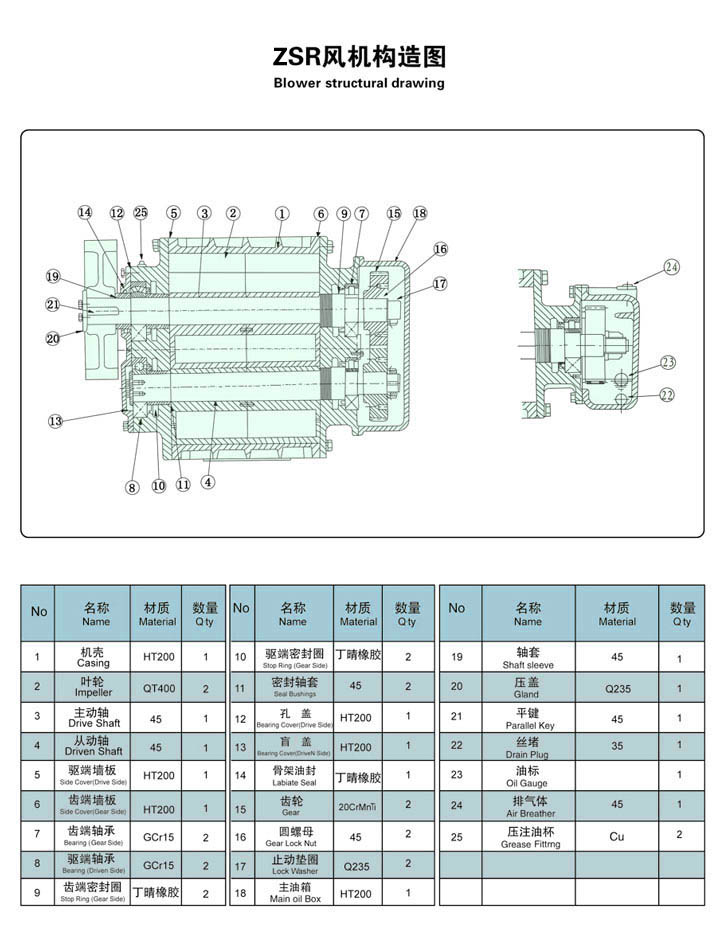 羅茨風機為定容積式風機,輸送的風量與轉數成比例,三葉型葉輪每轉動一次由2個葉輪進行3次吸、排氣,與二葉型相比,氣體脈動變少,負荷變化小,機械強度高,噪聲低,振動也小。在2根平相行的軸上設有2個三葉型葉輪,輪與橢圓形機箱內孔面及各葉輪三者之間始終保持微小的間隙,由于葉輪互為反方向勻速旋轉,使箱體和葉輪所包圍著的一定量的氣體由吸入的一側輸送到排出的一側。各支葉輪始終由同步齒輪保持正確的相位,不會出現互相碰觸現象,因而可以高速化,不需要內部潤滑,而且結構簡單,運轉平穩,性能穩定,適應多種用途,已運用于廣泛的領域。