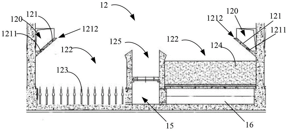 參見圖1和圖2,v型濾池包括進水總渠和多個濾池本體12,每個濾池本體12包括v型槽121、濾池部122、排水渠125、長柄濾頭123和均質濾料124等,排水渠125的端壁上開設有排污口1251。v型濾池的過濾工作原理是:由進水總渠流入經(jīng)進水閥13流進來的待濾水,漫過堰口14經(jīng)兩邊側孔120進入兩側v型槽121,從v型槽121槽底的配水孔1211和v型槽121的槽堰1212同時進入濾池部122內部,再由均質濾料濾層124過濾后變?yōu)榍逅逅畯臑V頭123流向底部空間16,又從方孔18匯聚氣水分配管渠15,最后經(jīng)管廊水封井、出水堰、清水管19流向清水池。